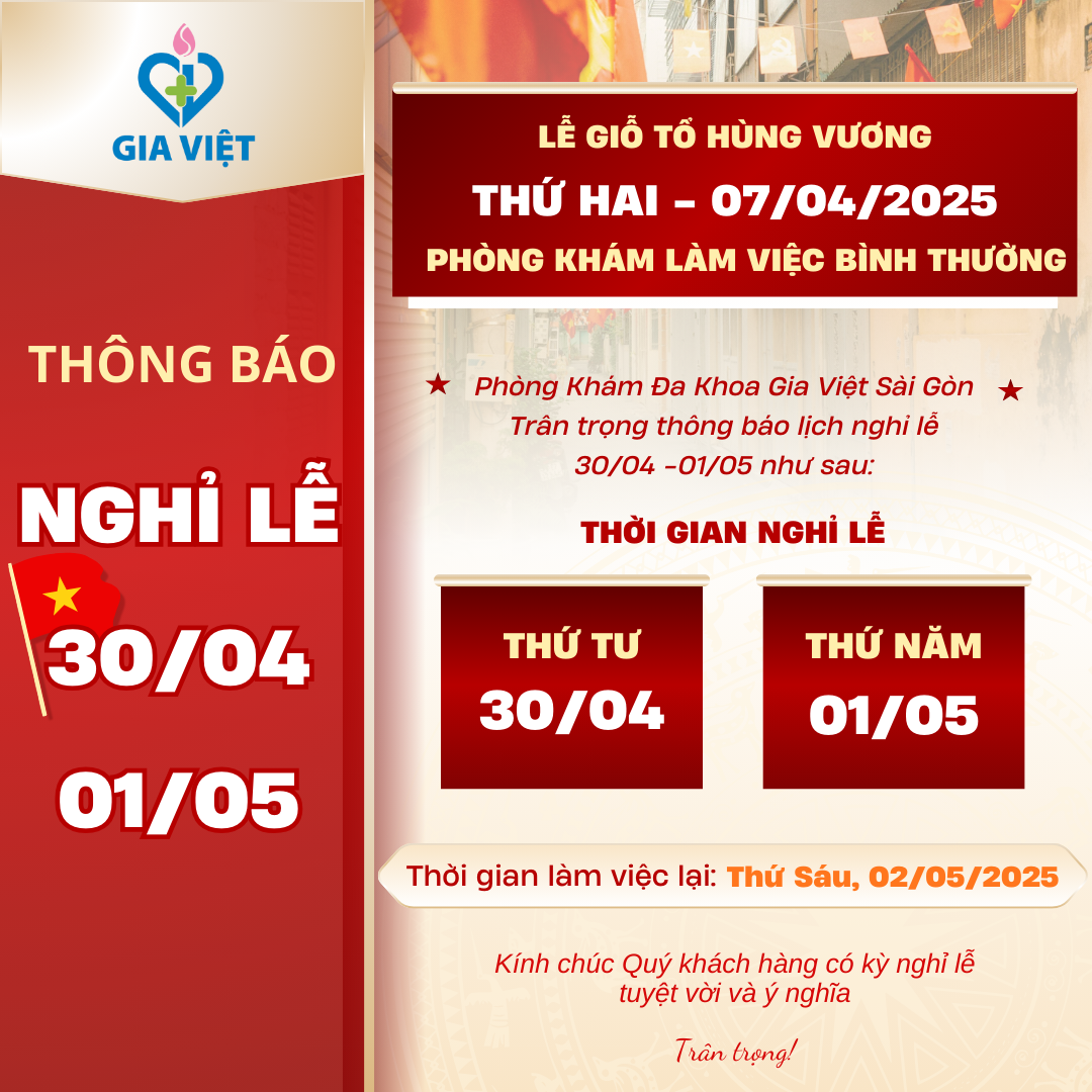 PHÒNG KHÁM ĐA KHOA GIA VIỆT SÀI GÒN TRÂN TRỌNG THÔNG BÁO LỄ GIỖ TỔ HÙNG VƯƠNG, Thứ 2 ngày 07/04/2025 Phòng khám làm việc bình thường. LỊCH NGHỈ LỄ […]